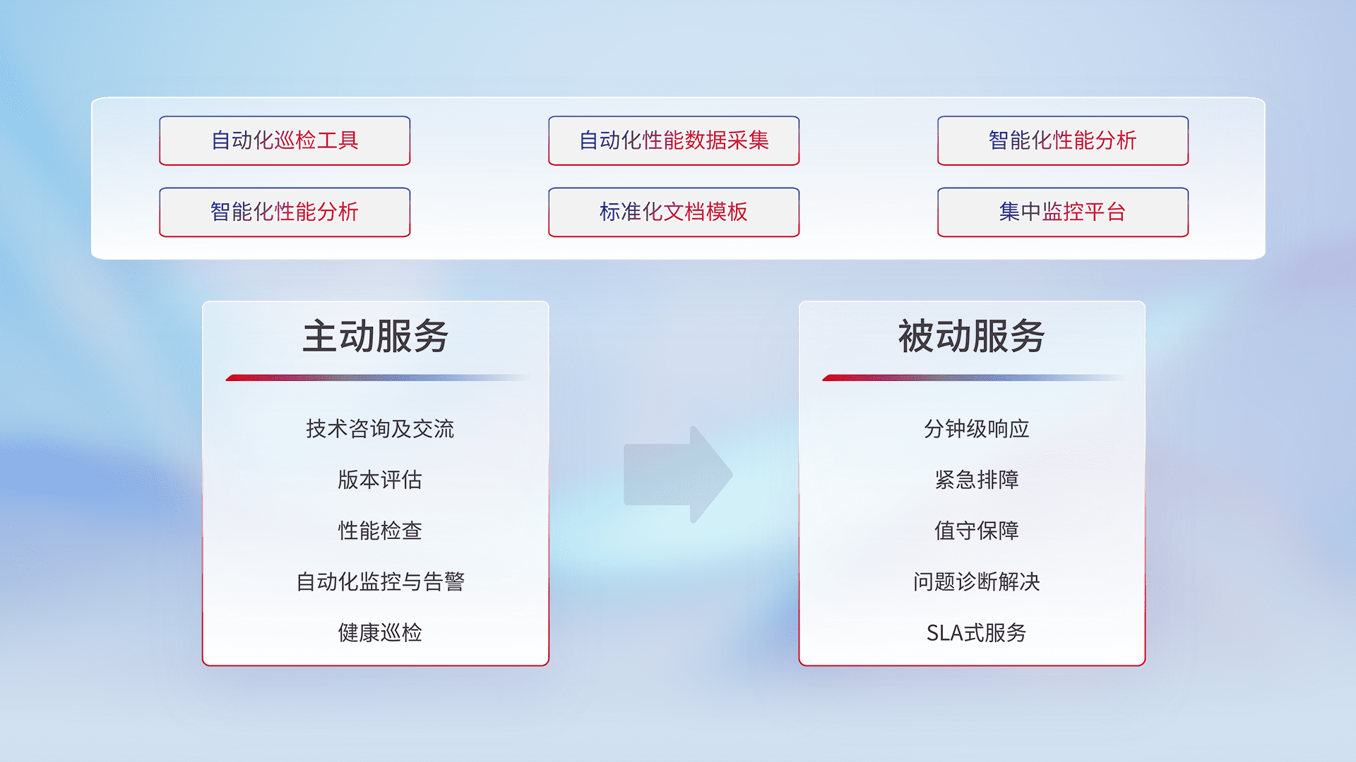 智能化工具和标准化文档,,保障服务质量,,提供主动服务(包含技术咨询、、、版本评估、、、性能检查、、、自动化监控与告警、、健康巡检)和被动服务包含(分钟级响应、、、、紧急排障、、、、值守保障、、、问题诊断解决、、、SLA服务)。。